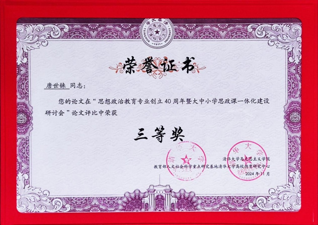公司硕士研究生唐世铼撰写的论文在“大中小学思政课一体化建设”优秀论文评选中荣获三等奖,并在分论坛上作题为《“大思政课”视域下地方红色文化融入高校思政课探究》的报告,这篇论文紧紧围绕如何将地方红色文化资源转化运用于大中小学一体化教学全过程来展开,得到与会专家学者的好评、建议和鼓励。