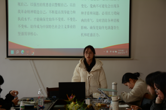 接着,马克思主义理论班颜美同学所在小组聚焦“新时代深入推进党的自我革命”的热点,结合最新政策文件,从党进行自我革命的核心要义以及实践路径两个角度作了系统阐述。